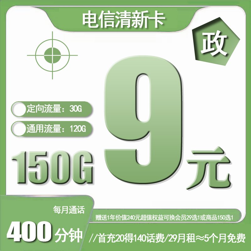 电信清新卡(售价150元 发货)9元120g通用30g定向400分钟通话,一年会员权益,18~28周岁