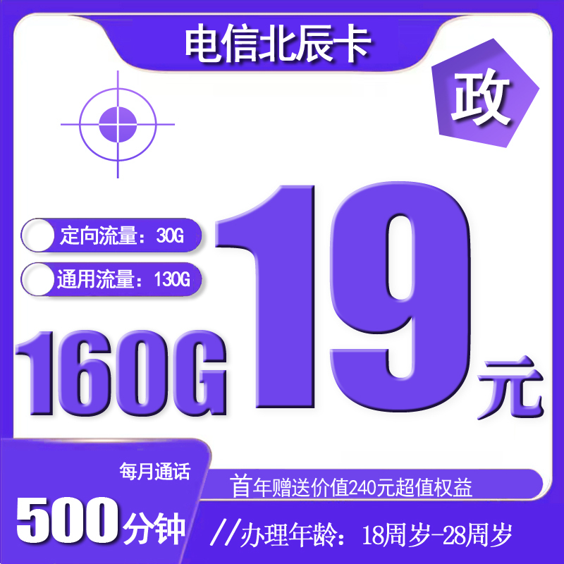 电信北辰卡(售价130元 补卡)19元130g通用30g定向500分钟通话,一年会员权益,18~28周岁