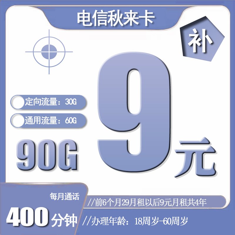 电信秋来卡(售价170元 发货)9元60g通用30g定向400分钟通话,18~60周岁